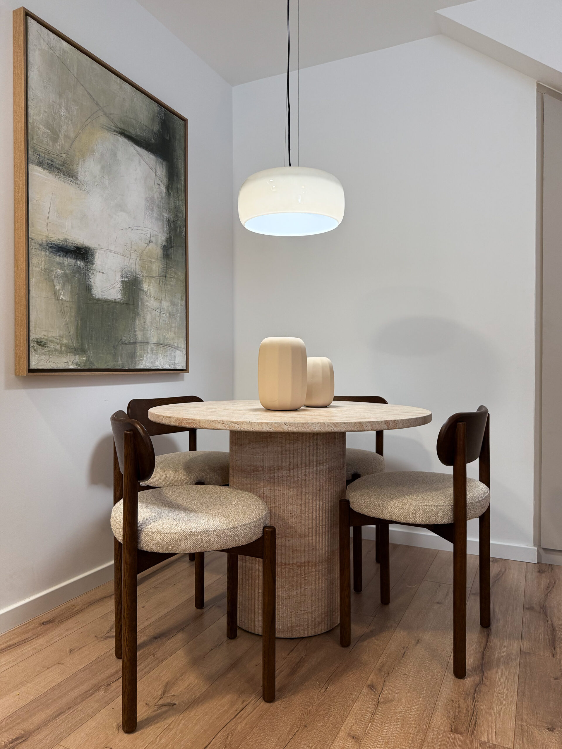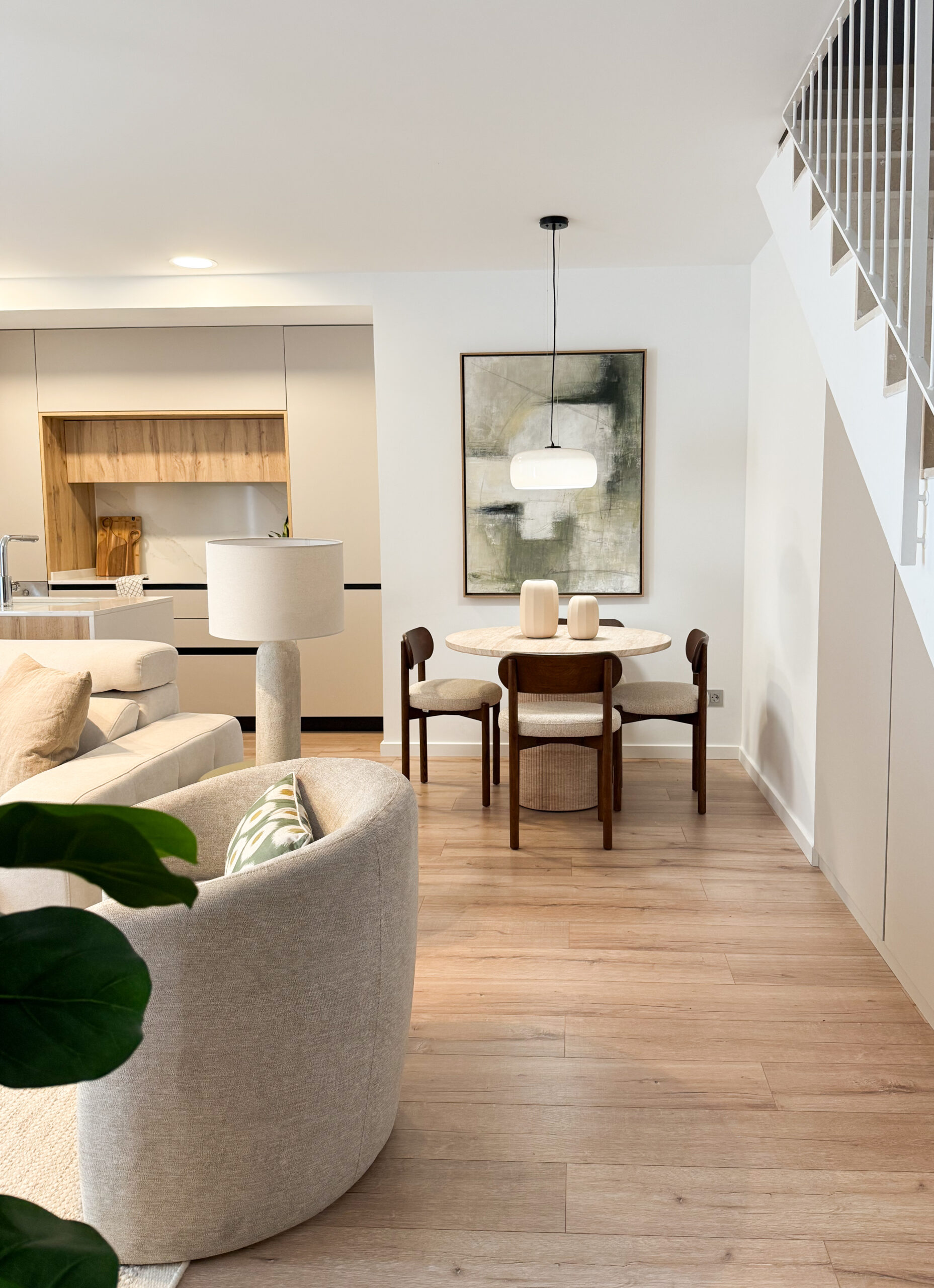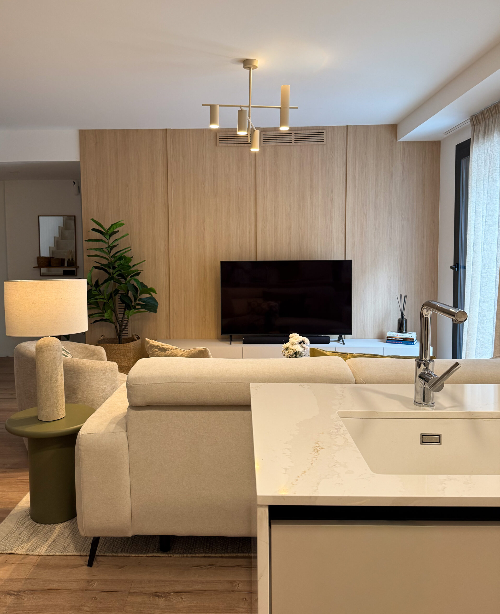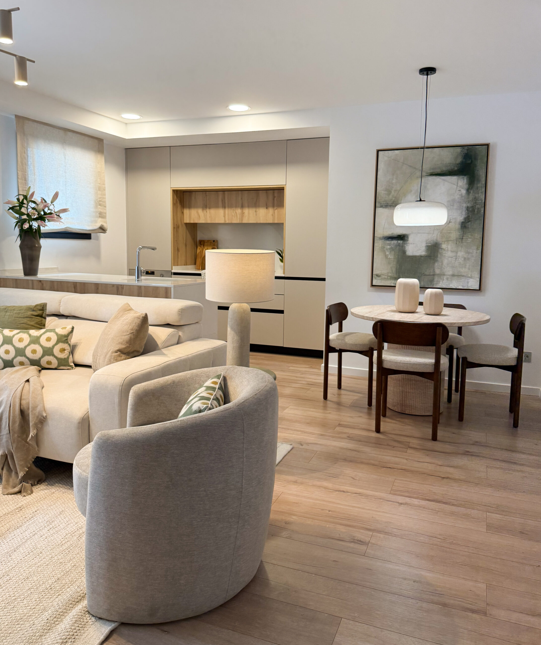 En este proyecto de vivienda tipo dúplex, nuestro objetivo fue dar forma a un hogar que respirara equilibrio y coherencia en cada detalle. Intervenimos en la zona de salón, comedor, cocina y baño, trabajando desde la base arquitectónica hasta los últimos toques de decoración y estilismo, para conseguir un espacio completamente pensado a medida de sus habitantes.