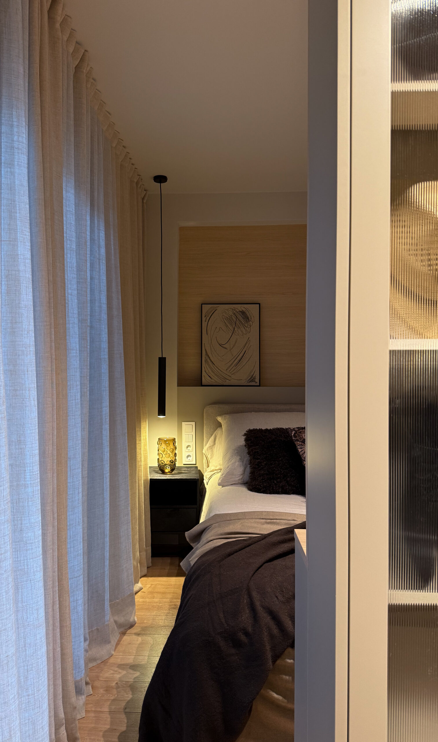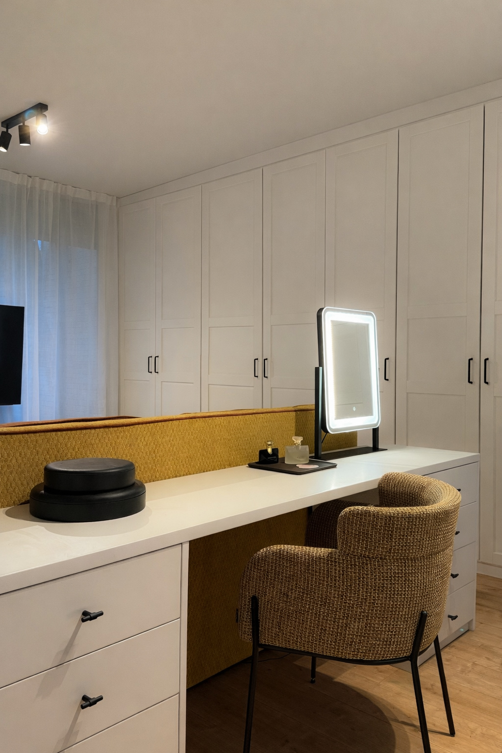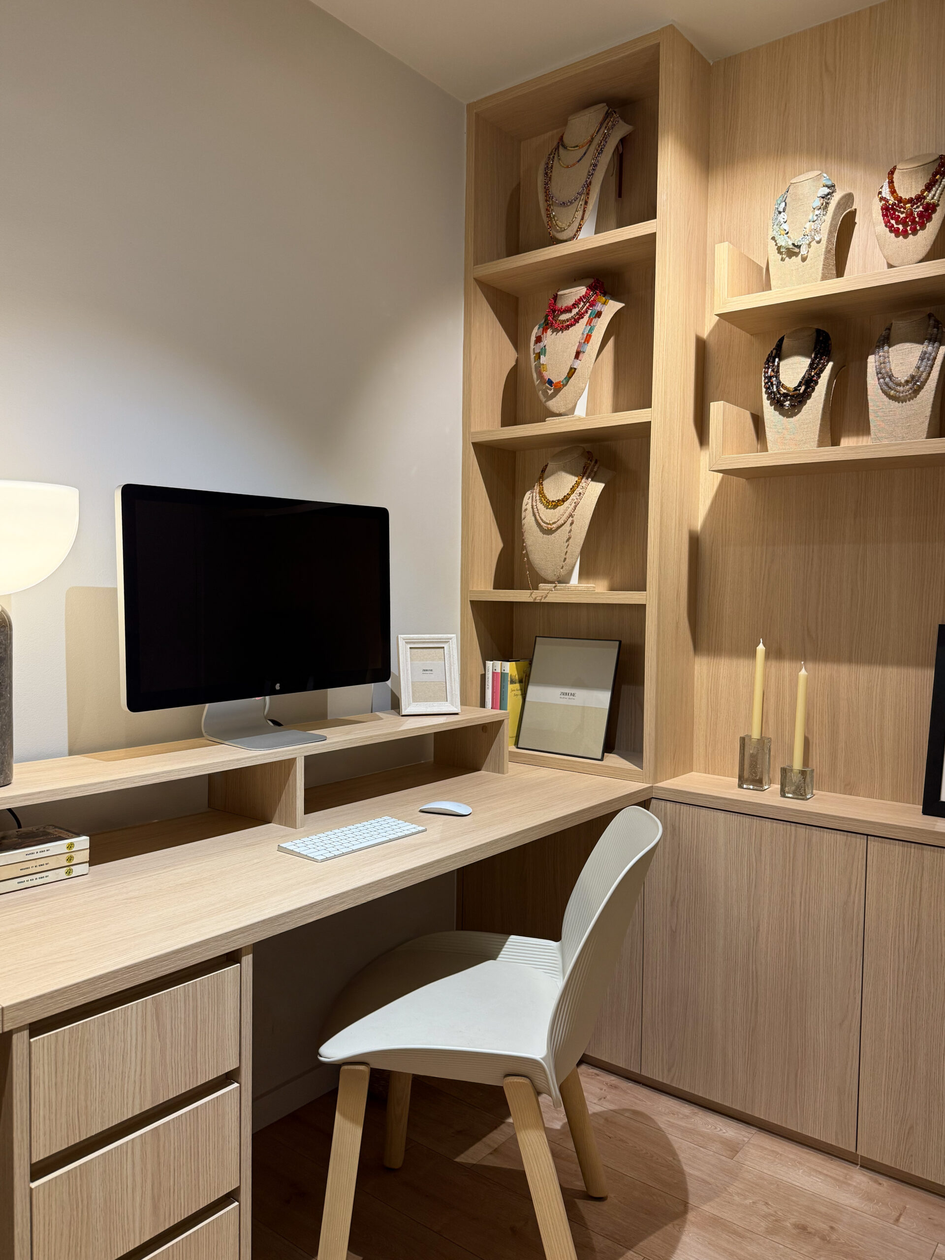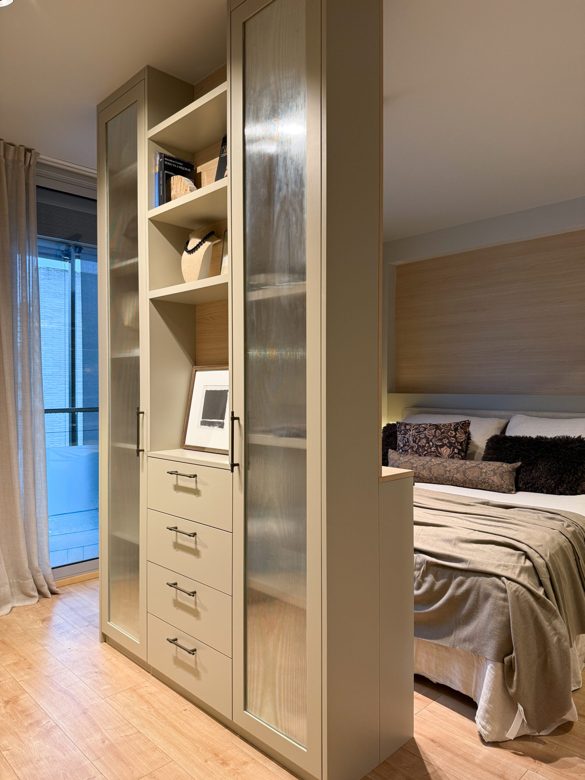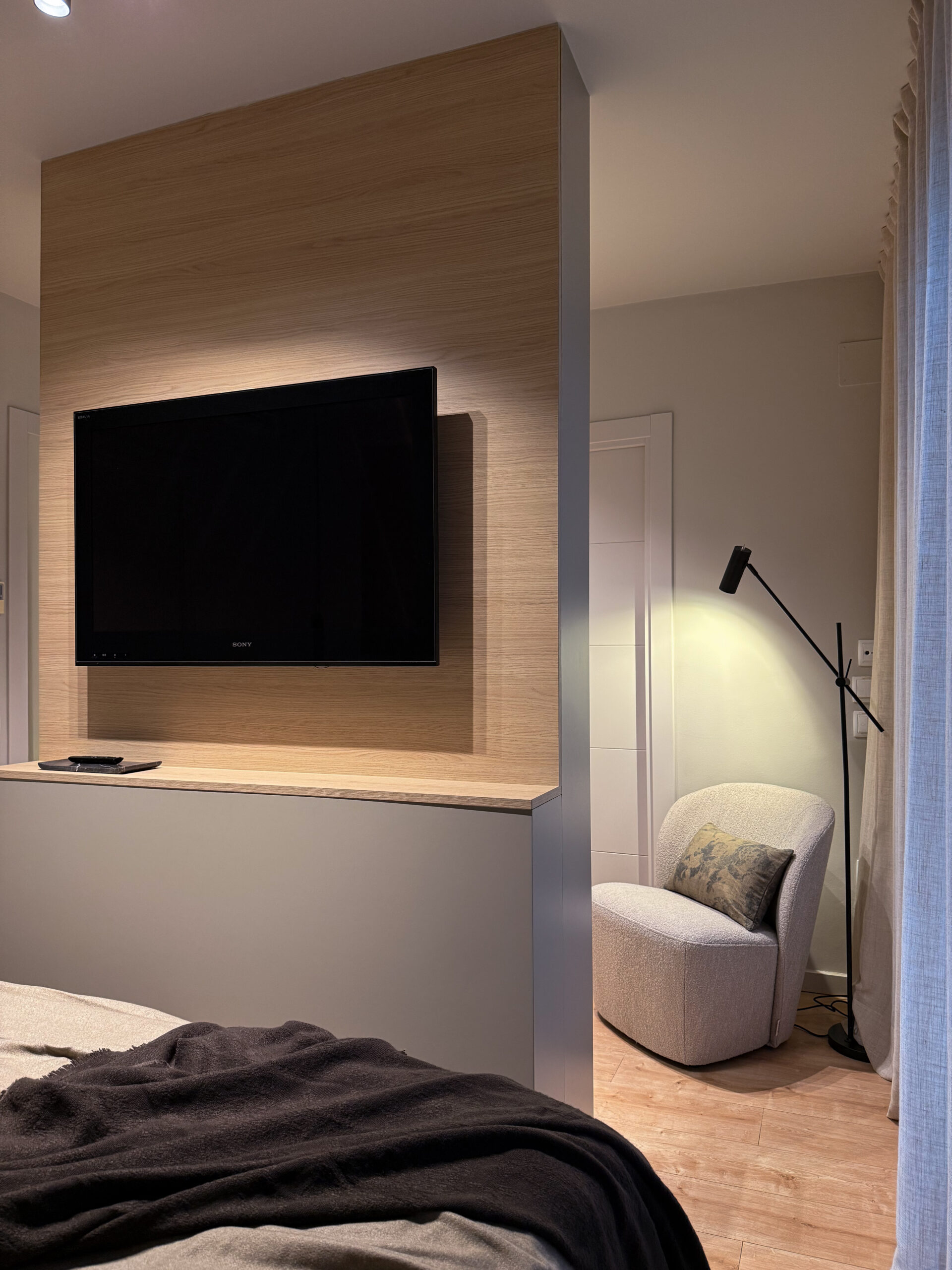 La carpintería a medida ha sido uno de los pilares del proyecto, utilizada como herramienta para organizar y definir los espacios. Gracias a ella se han resuelto de forma eficaz las distintas estancias, integrando grandes zonas de almacenaje que permiten liberar visualmente los espacios y mejorar su uso diario. Esta planificación ha permitido una distribución fluida, sin huecos innecesarios, donde cada elemento tiene una función concreta.