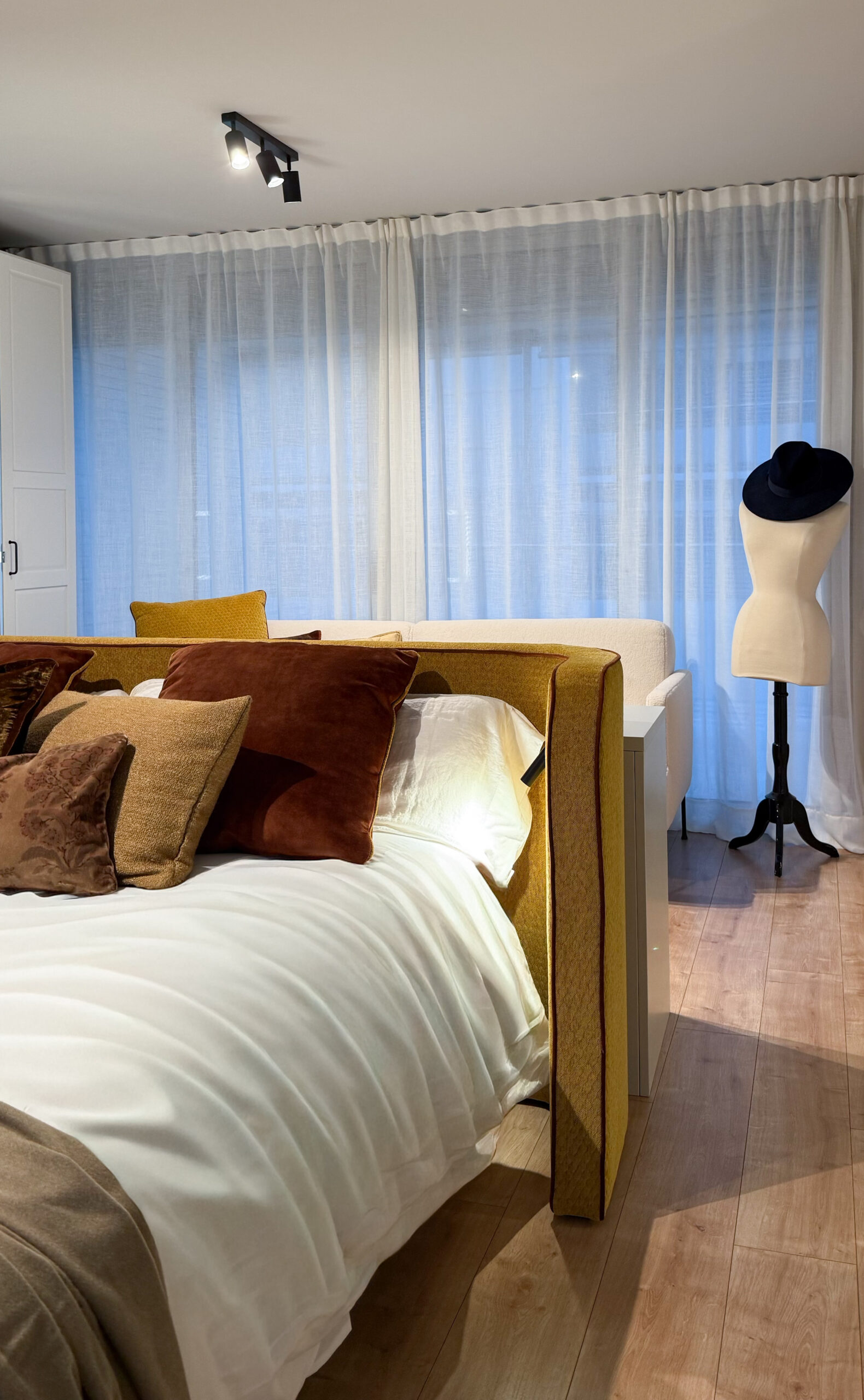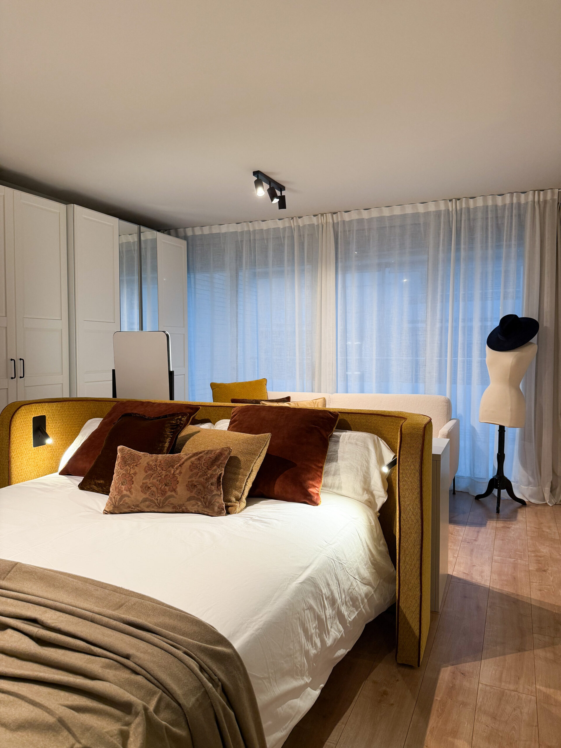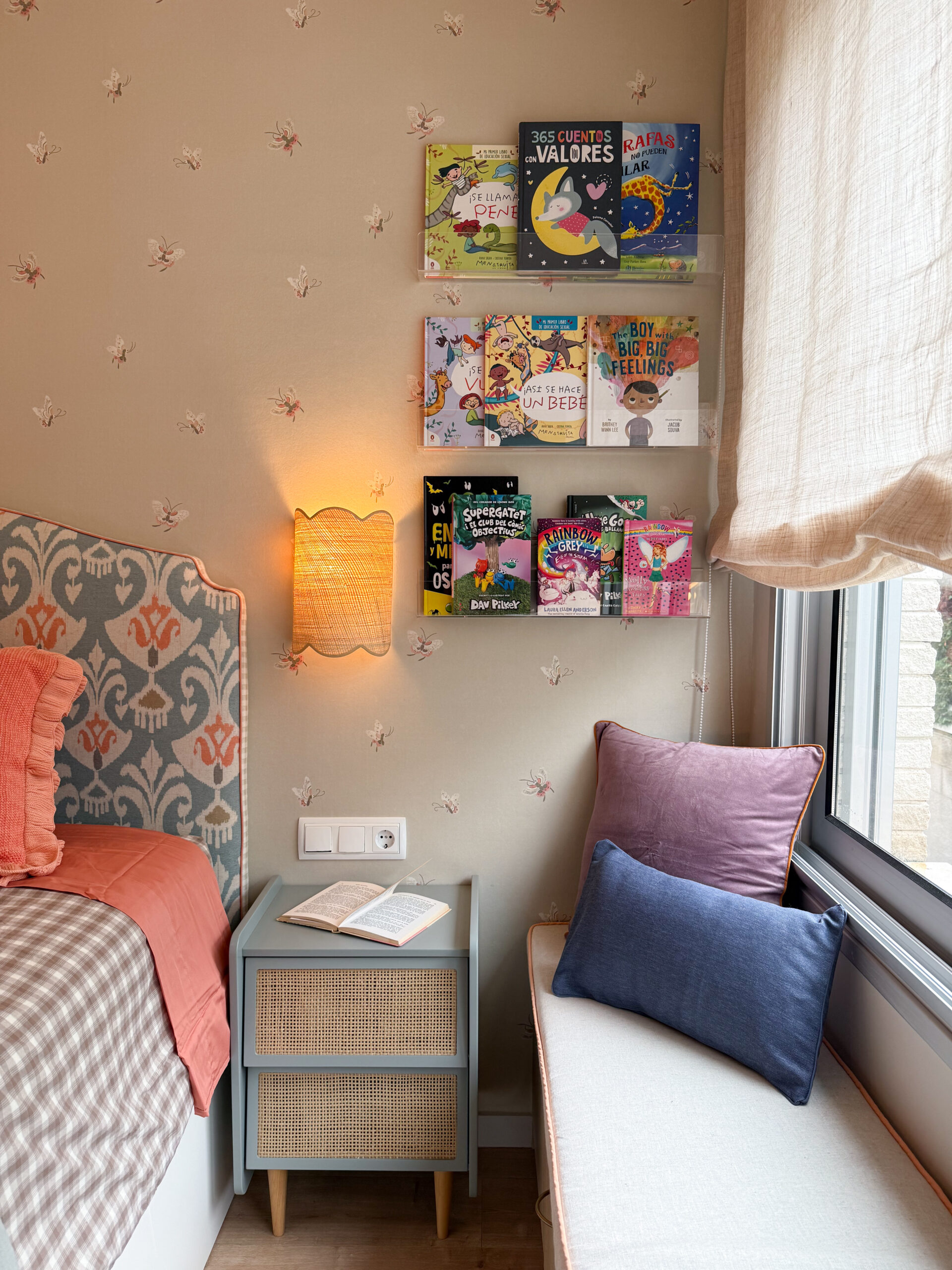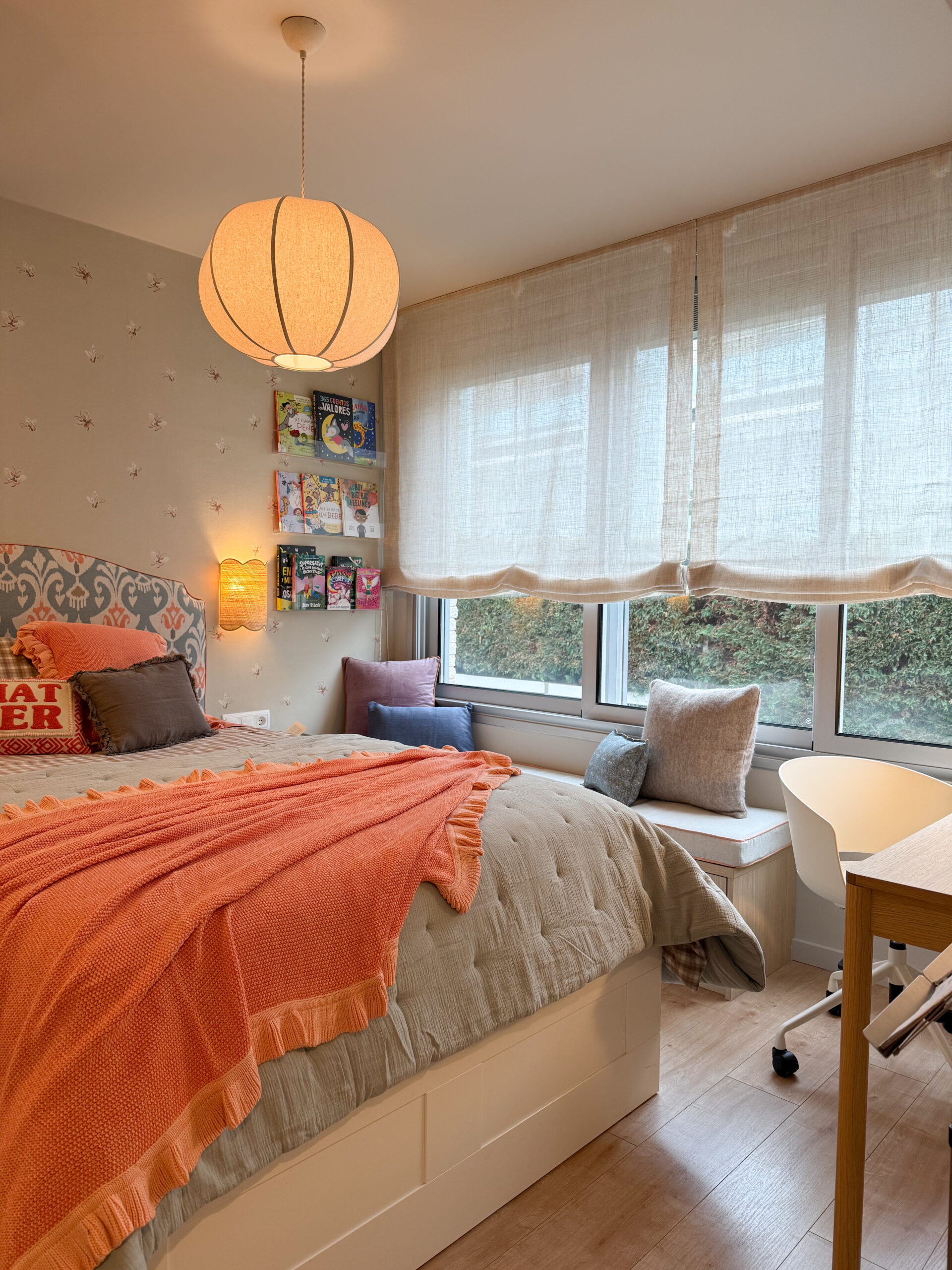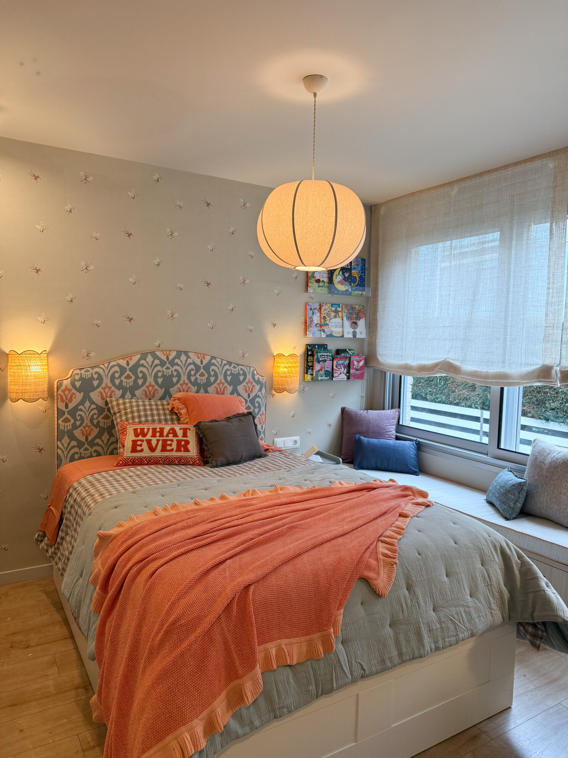 El proyecto incluye la transformación de las antiguas golfas en una nueva habitación con tocador, la incorporación de papeles pintados que aportan carácter y personalidad, y una gran estantería de hierro diseñada a medida que actúa como elemento central y distintivo de la vivienda. Como cierre del proyecto, se ha trabajado cuidadosamente la selección de textiles y la decoración, pensados para completar los espacios y reforzar la coherencia y el carácter global de la vivienda.