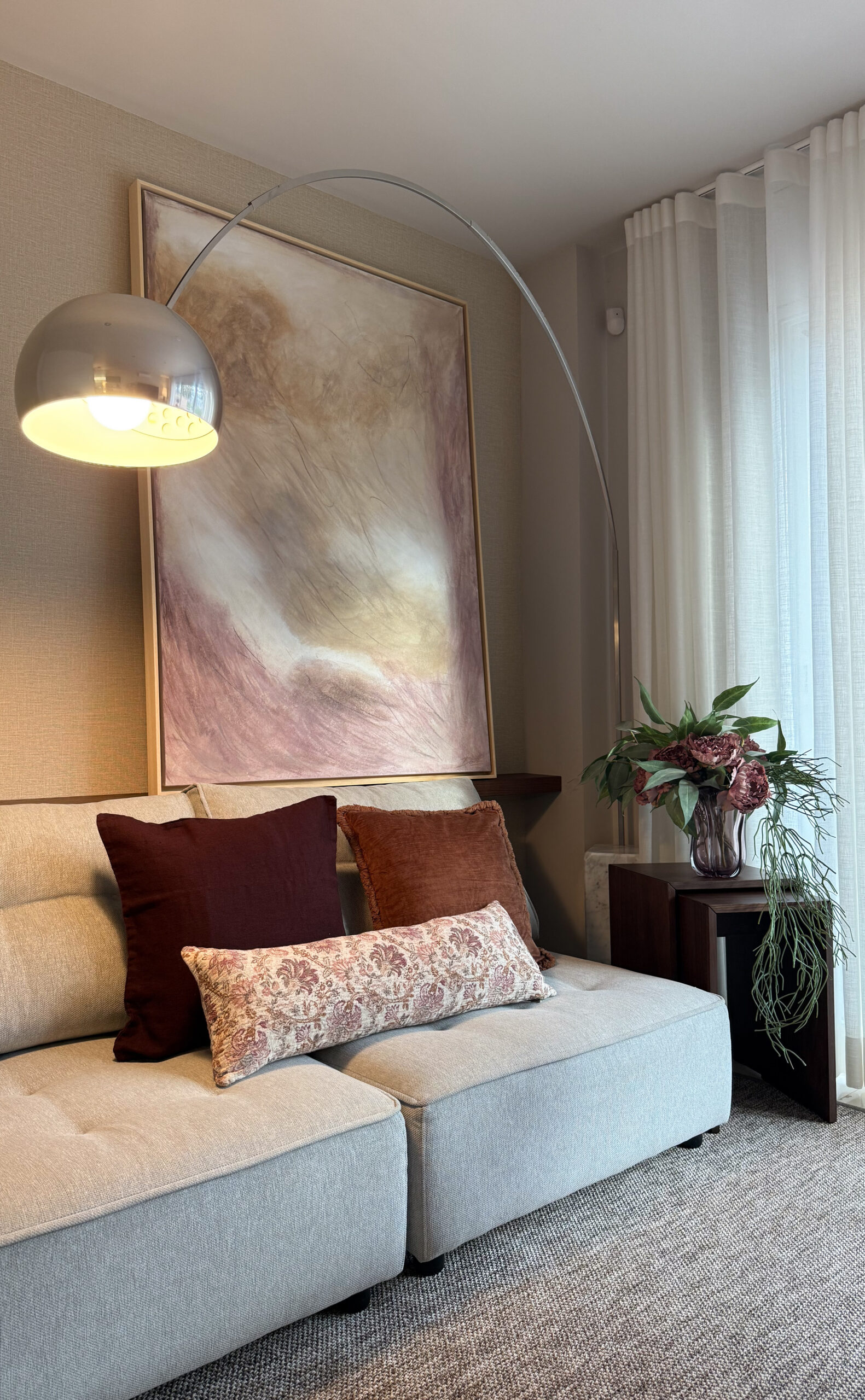 Destaca también el cuadro situado detrás del sofá, diseñado a medida junto a una artista con la que colaboramos habitualmente. Una obra creada específicamente para este proyecto, donde los colores encajan a la perfección con la estética global del salón.
