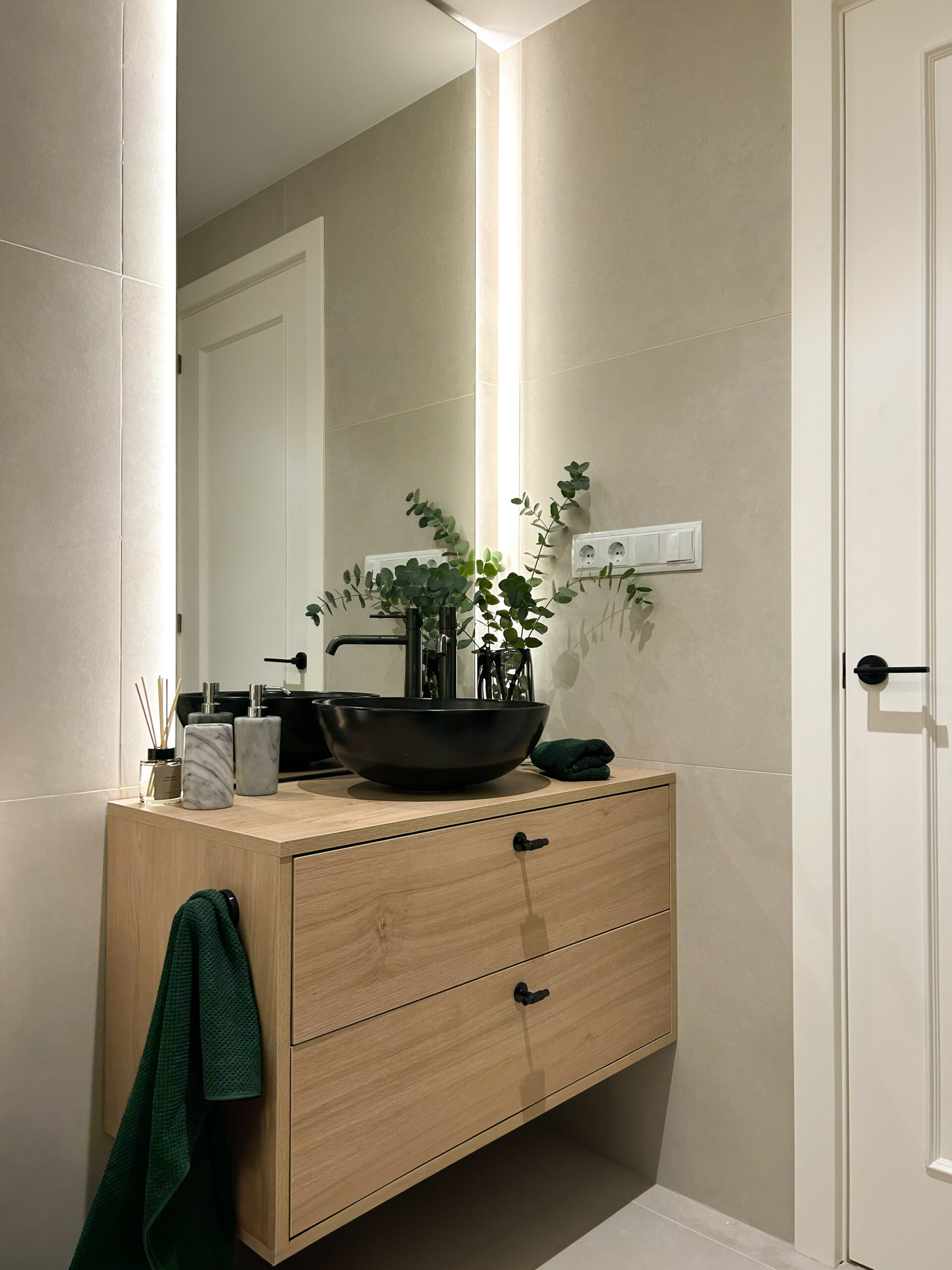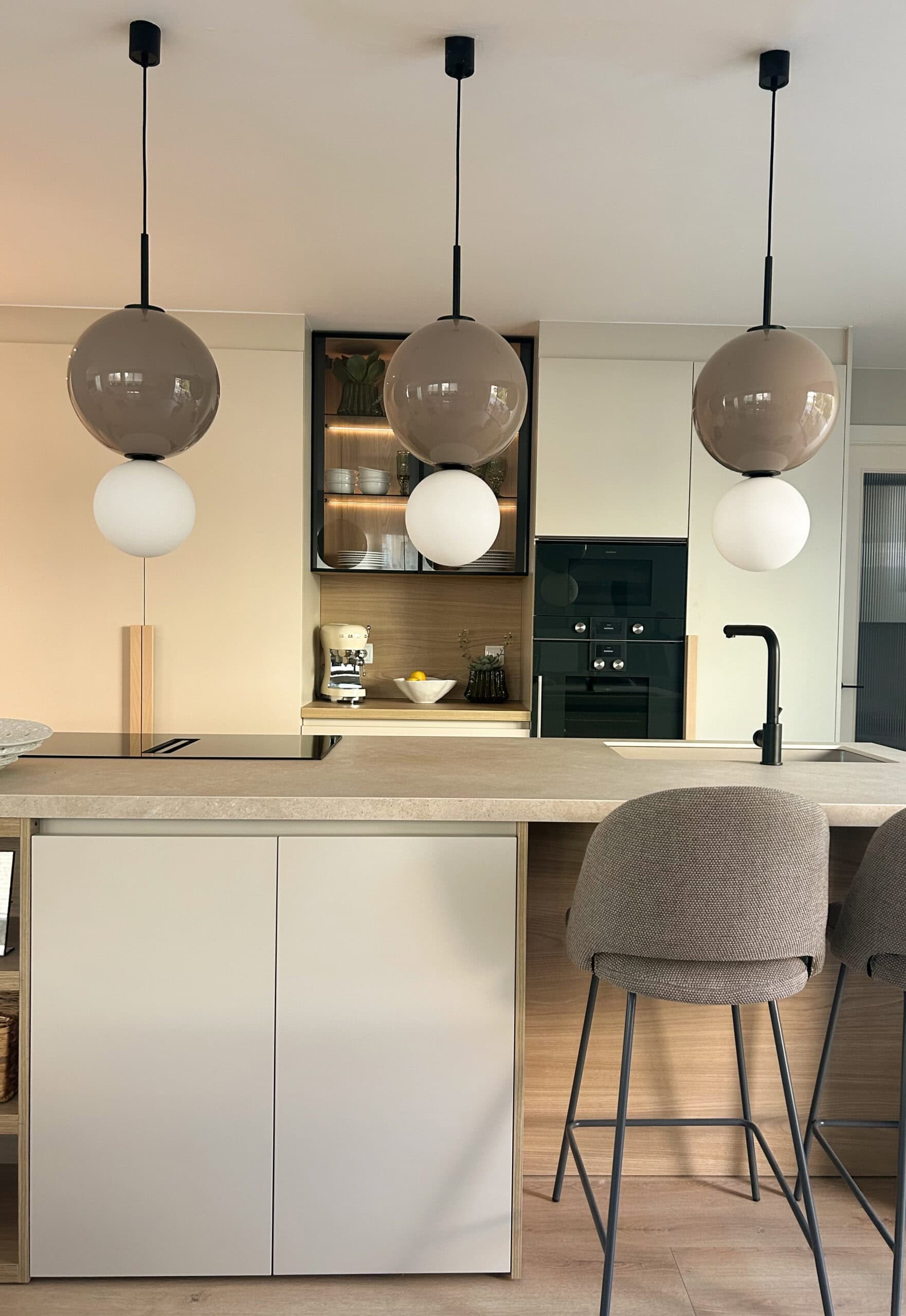 Uno de los puntos clave de la intervención ha sido la cocina. Originalmente un espacio cerrado, se ha abierto por completo al salón-comedor, creando un ambiente mucho más amplio, luminoso y fluido. El corazón de esta nueva zona es una gran isla central, que articula el espacio y se convierte en el punto de encuentro de la vida familiar. El mobiliario, diseñado a medida, y el atrezo final completan la estancia aportando personalidad y calidez.